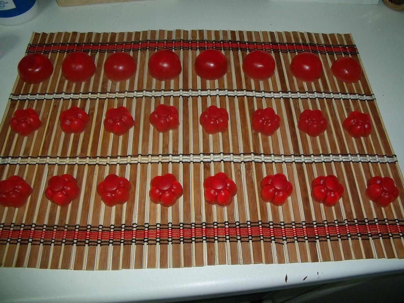 Mirad, estos fueron mis primeros jabones, están hechos con jabón de glicerina del super, colorante rojo alimenticio y aroma de vainilla. Usé vainilla de la que venden para hacer flanes.