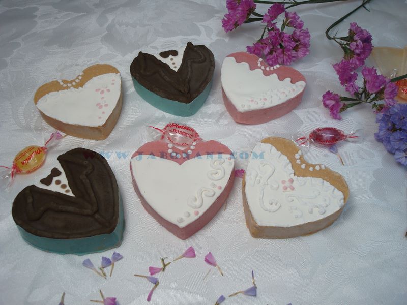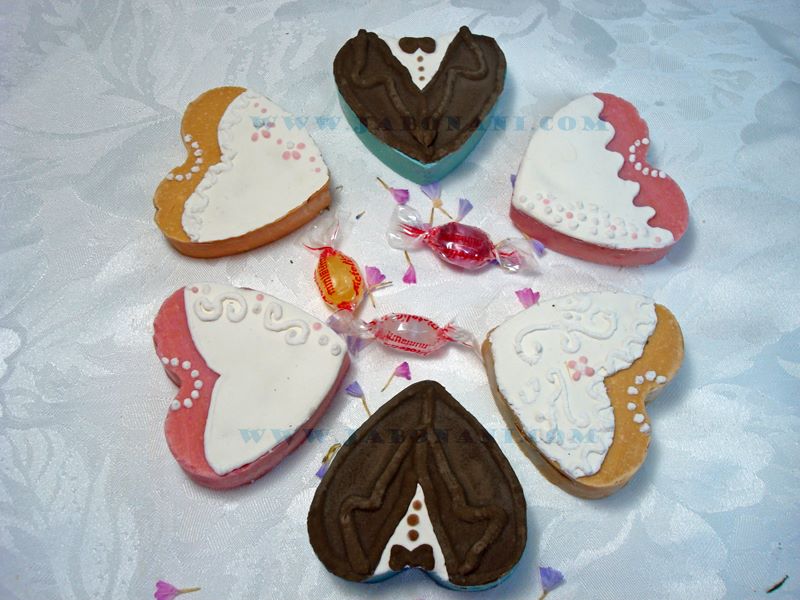Y otros diseños de corazones en los que la decoración está basada en los respectivos trajes de los novios, muy divertidos de crear pero en los que hay que tener paciencia a la hora de elaborarlos ya que en esta ocasión el juego mas que con los colores está en las texturas del jabón y en controlar que no espese demasiado rápido ya que sino es imposible de elaborarlos.