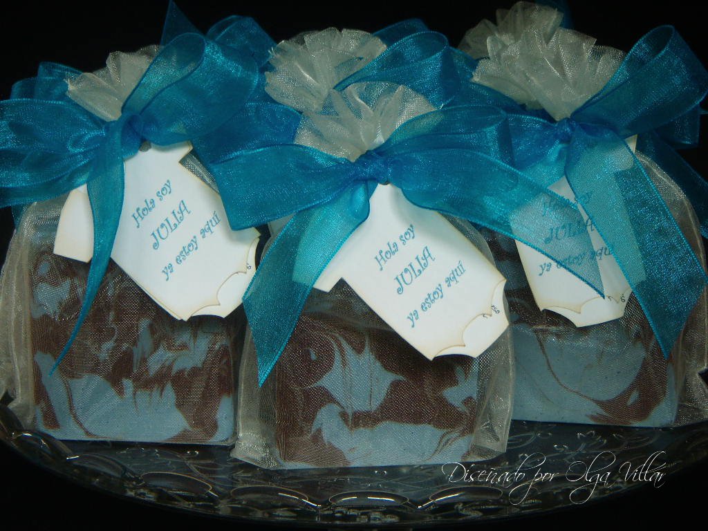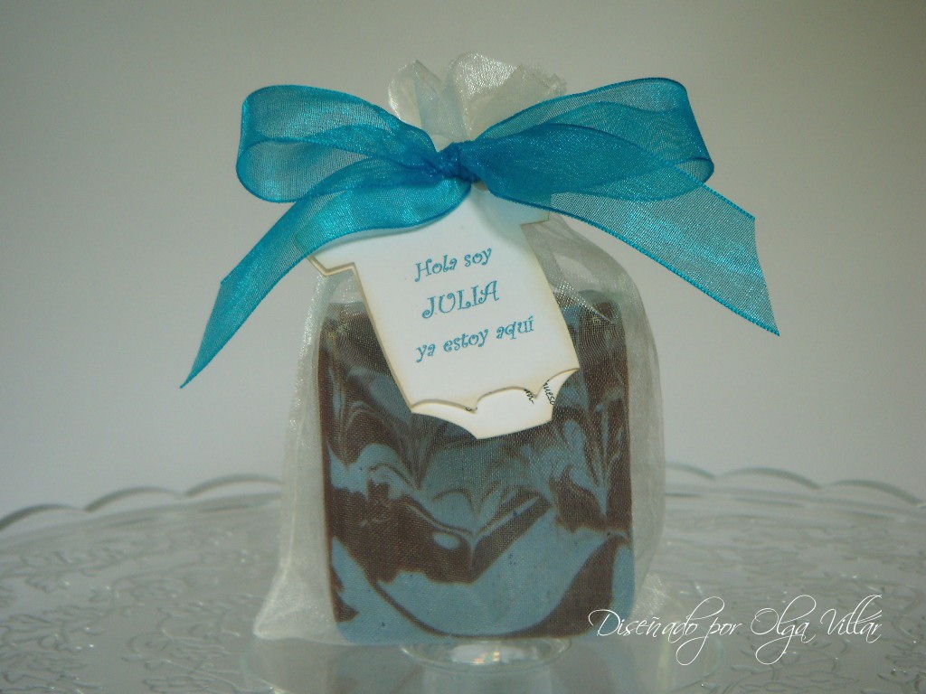 Para ello, elegí bolsitas de organza en tono beige y lazos de organza en tono turquesa, complementando el color del jabón azul y marrón con ese aroma delicado del azahar.