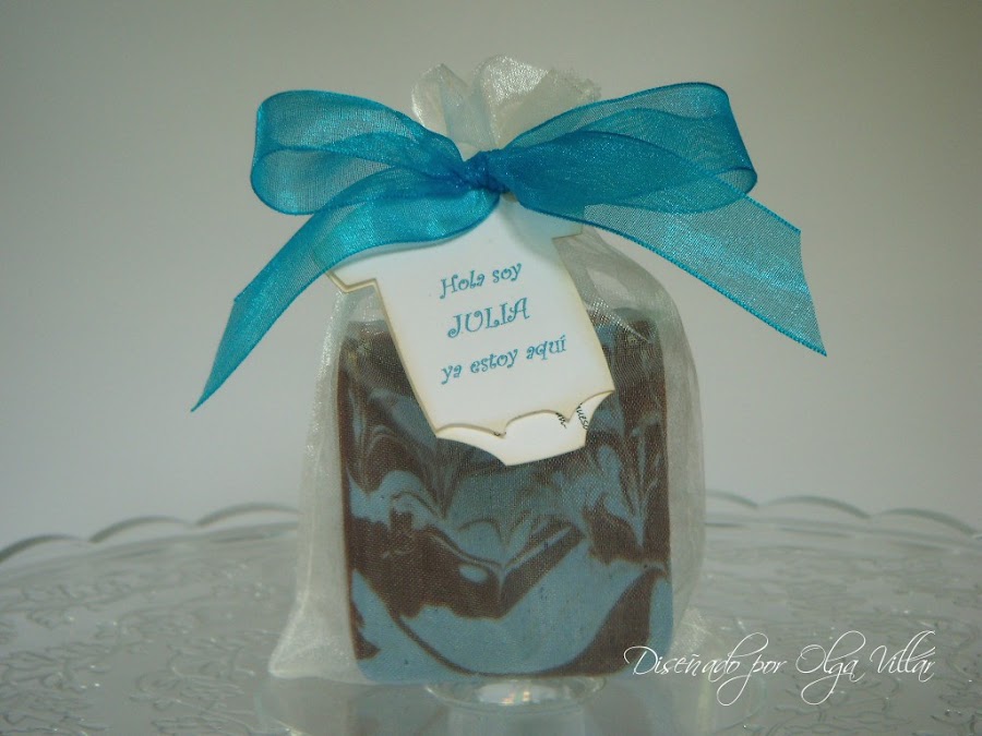Bueno pues con esas pautas, preparé el jabón de azahar y canela ( ver aquí), pero modificando un poco el tamaño para adaptarlo al envoltorio, y después de seis semanas de curación, preparé estos delicados detalles para agasajar a sus amistades con motivo del nacimiento de Julia, su primera nieta.