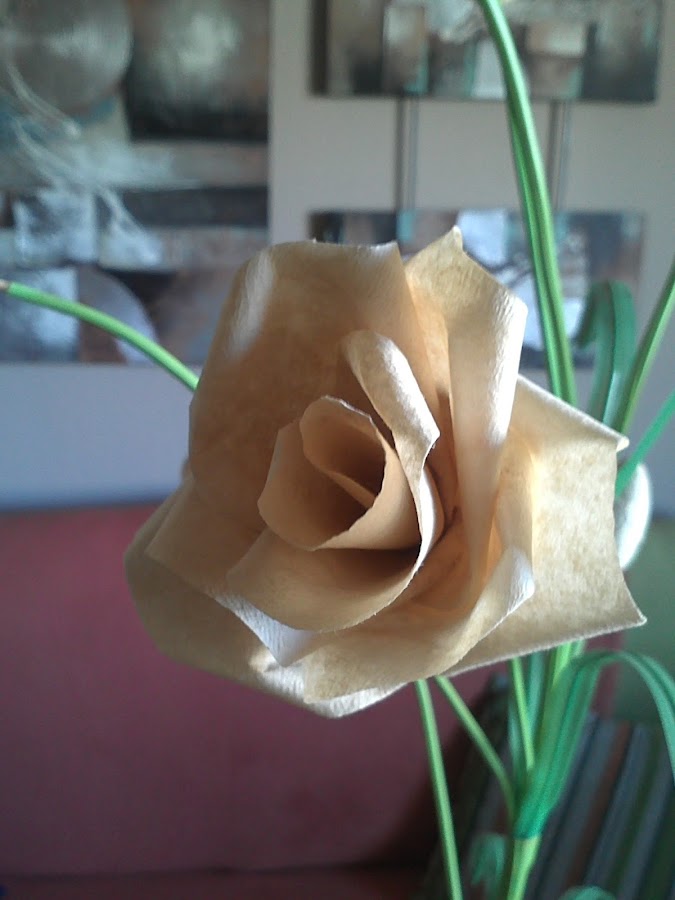 Tanto las rosas como los capullos están hechas con filtros de café usados ,he aprovechado las ramas de mi antiguo ramo de flores, donde he insertado mis flores y capullos .El jarrón también lo hice con los filtros, pero los más oscuros.