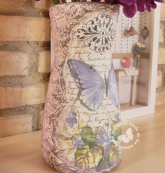 Me encanta tener flores frescas decorando mi casa, pero no sólo las flores son bonitas, el recipiente que las alberga también creo que debe decir algo y personalizar un Jarrón es muy sencillo, en este caso he utilizado la técnica del decoupage, así de fácil, una imagen que me encanta como son las mariposas y para el resto del jarrón con papel de cocina le he dado textura.