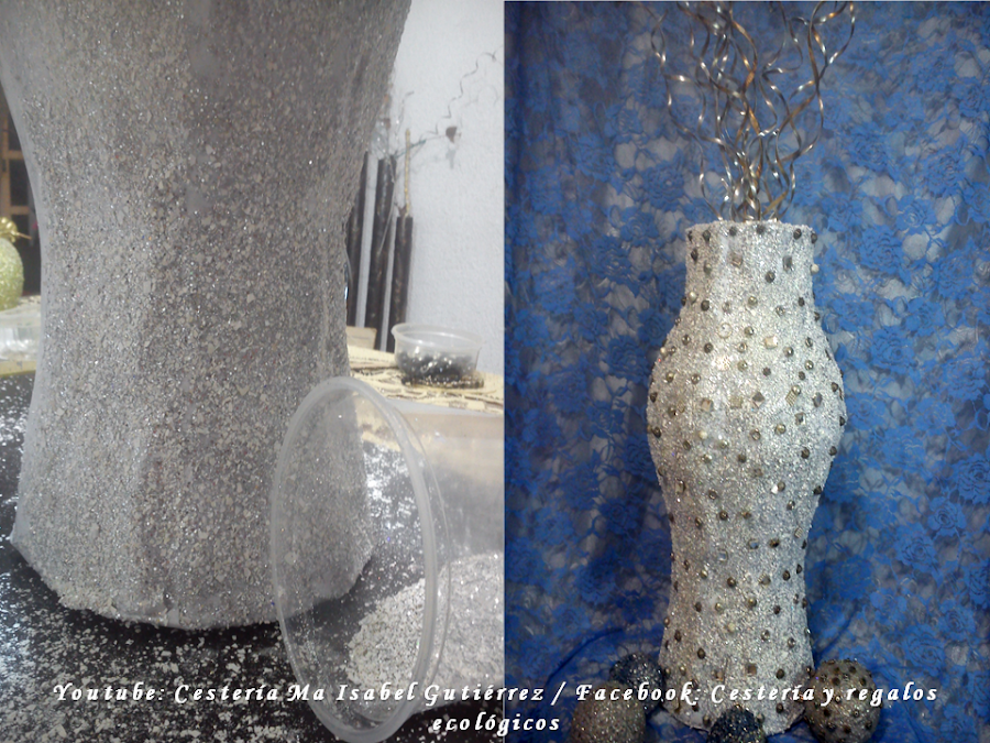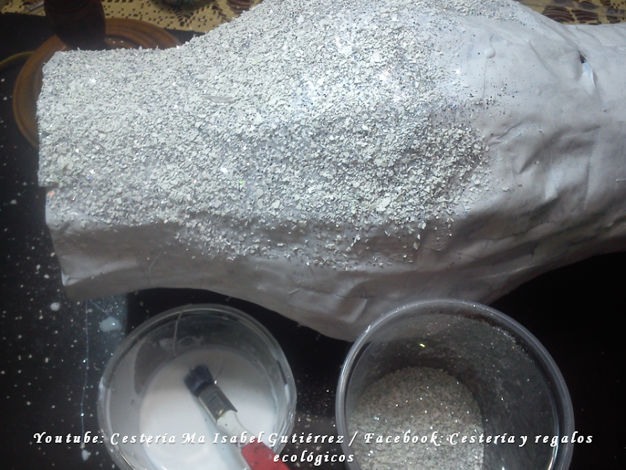 A continuación, ponemos una capa gruesa de pegamento o cola blanca y dejamos caer cascarones de huevos triturados combinados con un poco de diamantina plateada. El cascarón se prepara dejándolos remojar en agua, jabón y unas gotas de cloro por aproximadamente una hora, luego, quitamos la telita interna que llevan, dejamos secar y trituramos con algo pesado...
