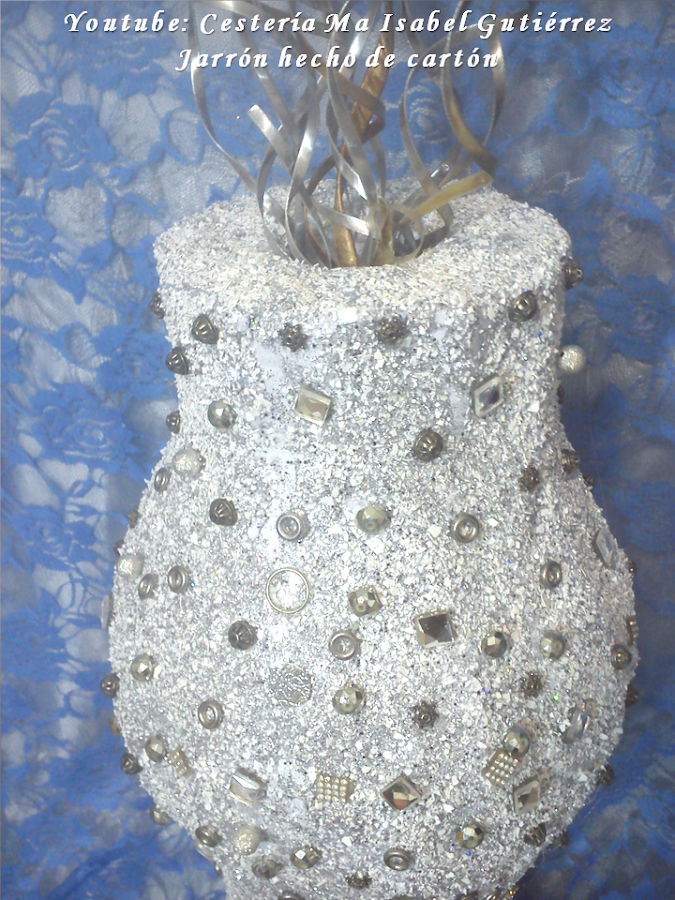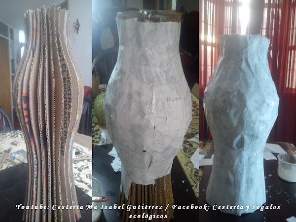Cortamos, con nuestras manos, pequeños pedazos de papel, de preferencia papel blanco de oficina para evitar pintar, pero lo mismo se puede hacer con pedazos de papel de diario o de revistas, forramos el jarrón sin olvidar la parte superior y la inferior, pegamos tres capas de papel dejando secar entre cada capa, lo hacemos con una mezcla muy aguada de pegamento o cola blanca y agua...