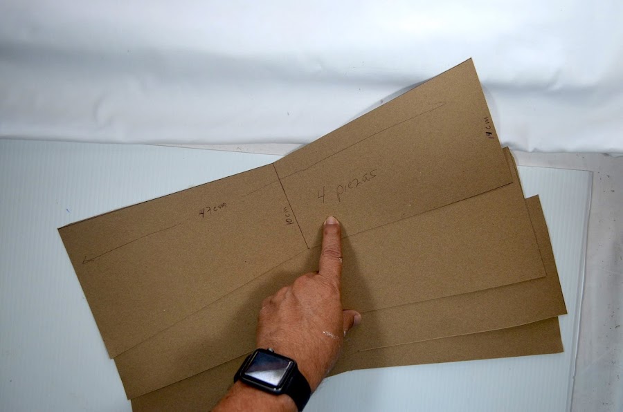 9. Por otro lado, cortamos 4 piezas en papel caple (cartón del grosor de la caja de cereal) de 47 cm de largo, 14 cm por los costados y 10 cm al centro, tal y como se ve en la imagen.