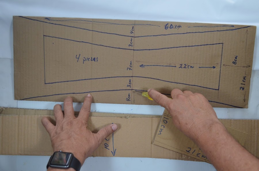1. Recortamos 4 piezas en cartón grueso con medidas de 60 cm x 21 cm, 2 piezas de 21 cm x 10 cm y tiras de cartón de 10 cm de ancho.