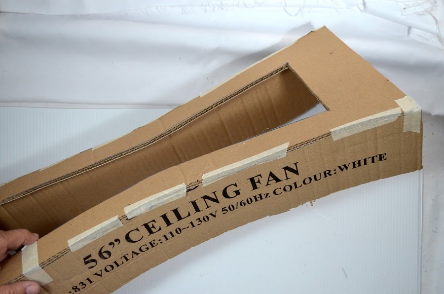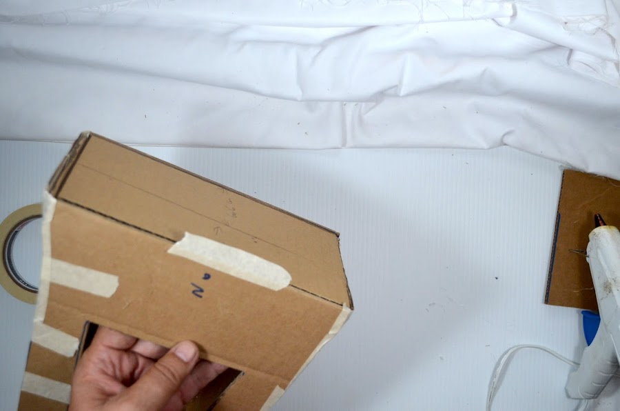 4. Con la ayuda de la cinta masking tape (cinta de papel) aseguramos las tiras de 10 cm a los costados de una pieza, tal y como muestra la imagen, a fin de que tome forma.