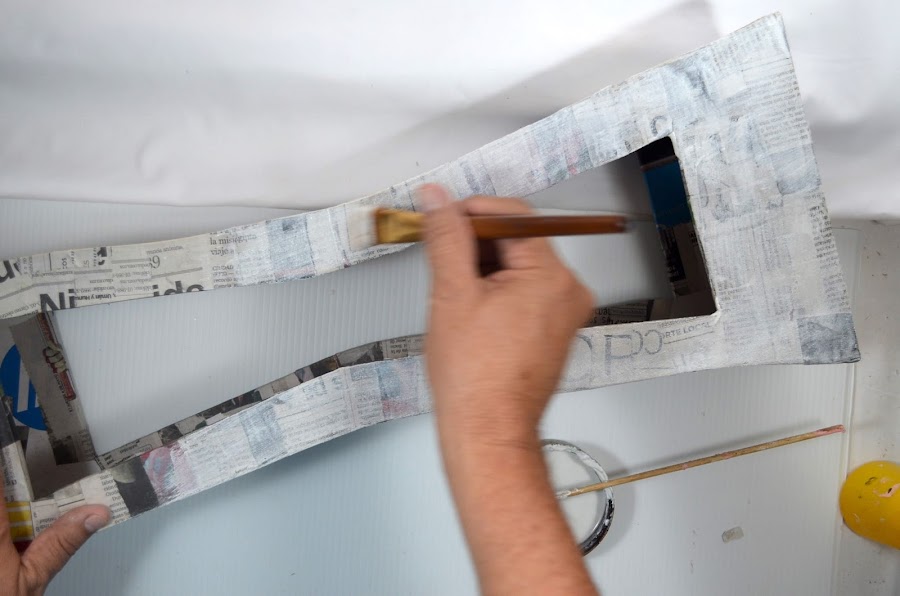 7. Le hacemos 2 capas de cartapesta, a los dos jarrones, utilizando engrudo casero y papel de periódico.