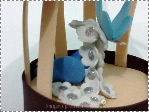 Realice un pajarito y unas lindas mariposas con la goma eva en diferentes tonos: (Azul cielo, celeste, rey), colocandolos por dentro y fuera de las jaulitas.