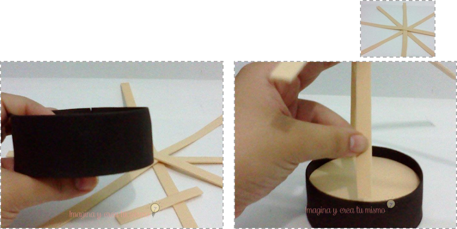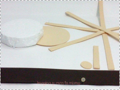 Hasta ahora debemos tener las tiritas de foami pegadas, el circulo de unicel cortado, así como