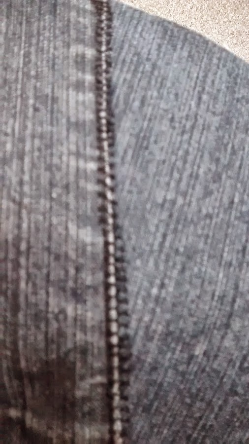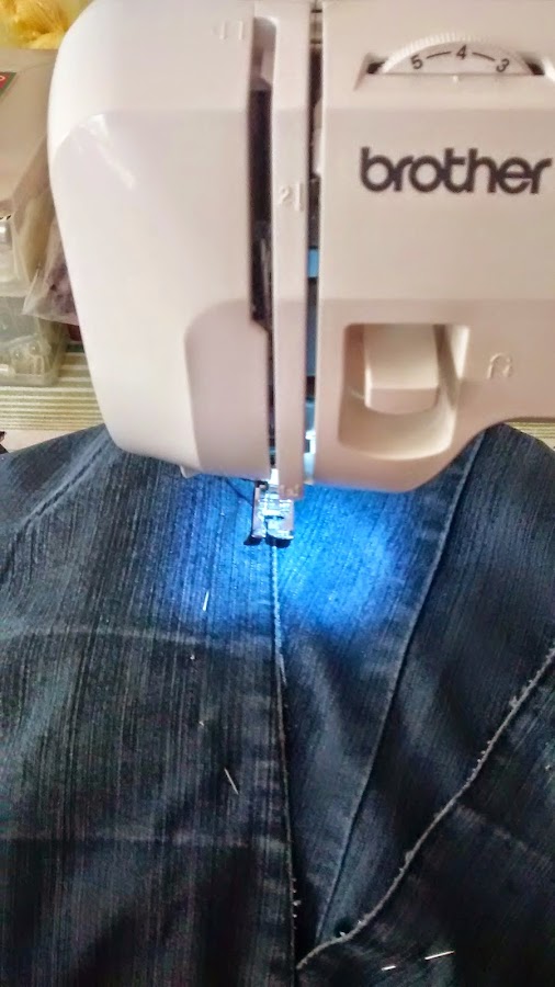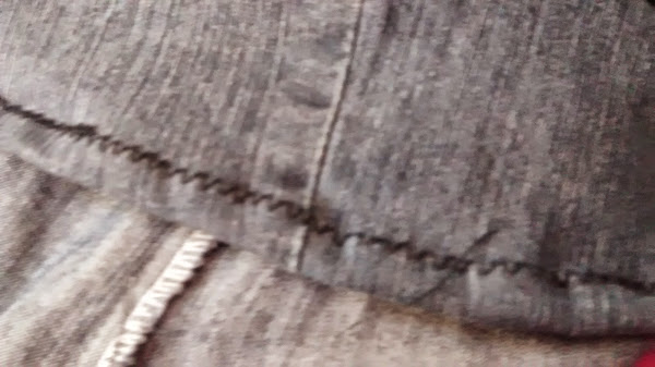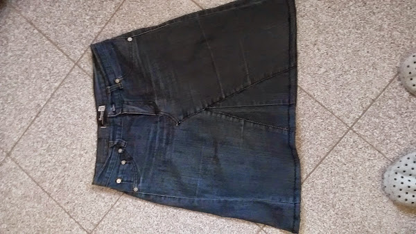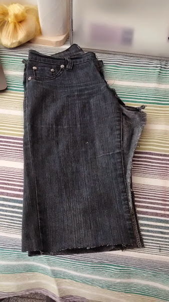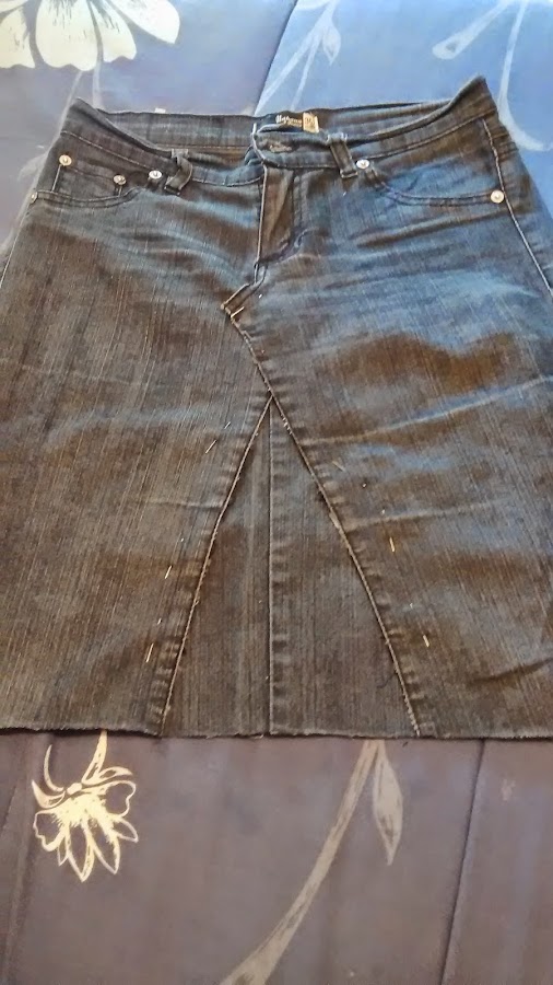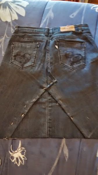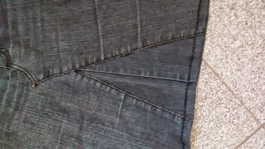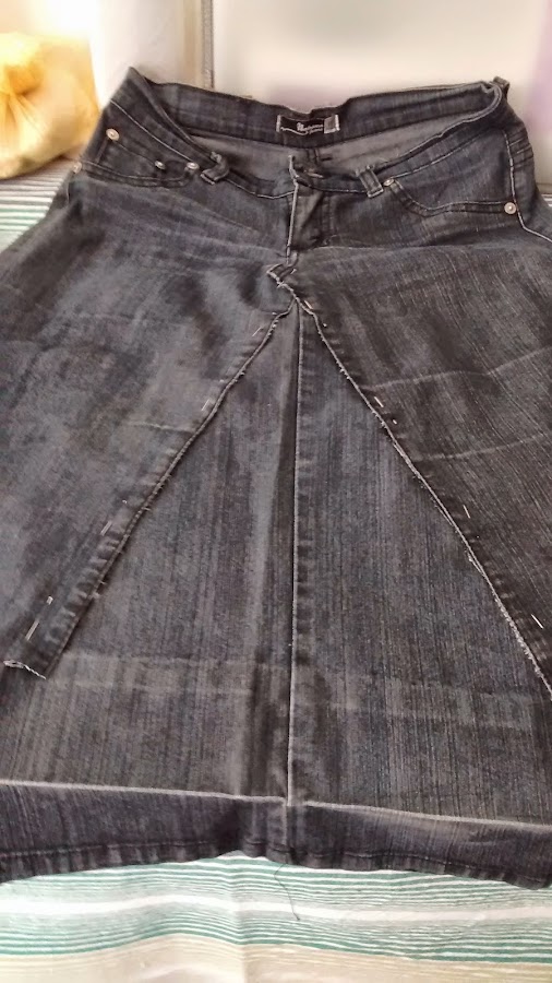 Paso 3: Coloco los retazos a agrear que los corté de las piernas que me quedaron. Los ubico coincidiendo las costuras y los corto del mismo largo de la falda.