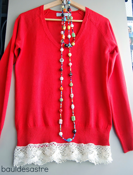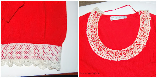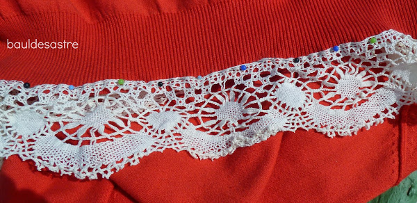 A mi madre se la despertó la bombilla y recordó que ella también tenía encajes guardados... encontró una bastante larga, pues quería colocarla en la parte inferior del jersey, en la zona del elástico.