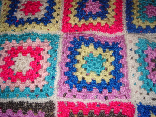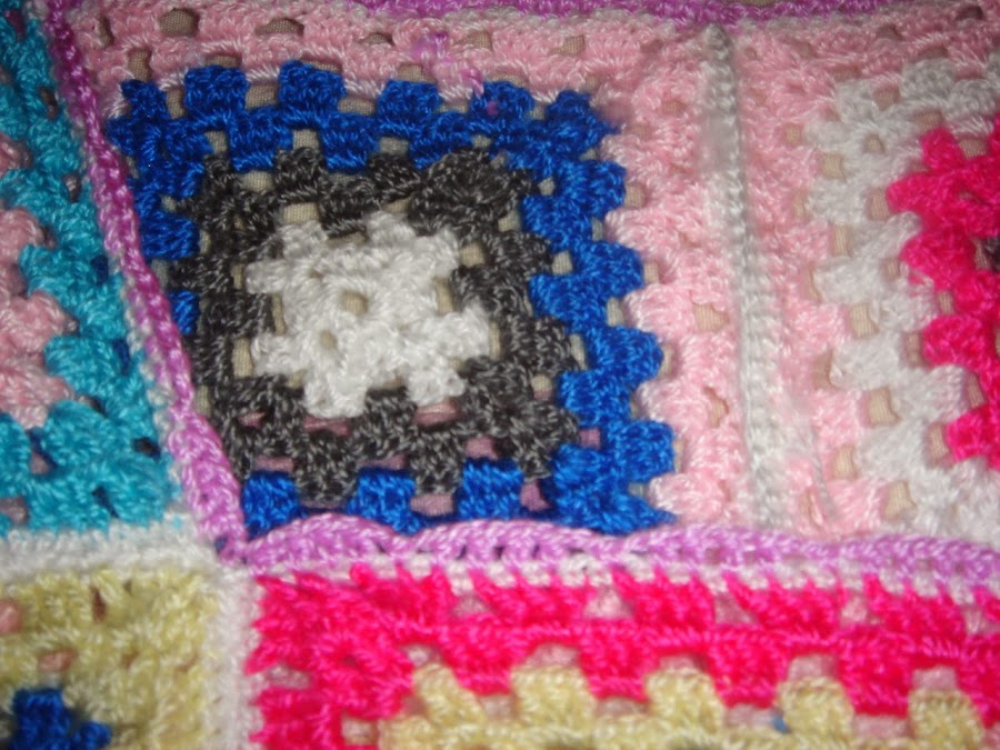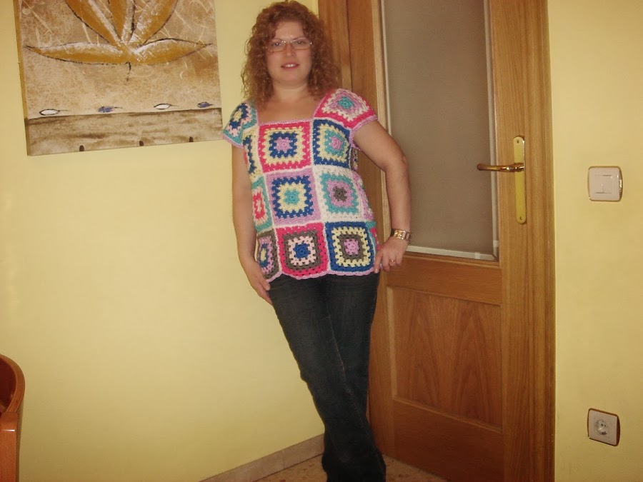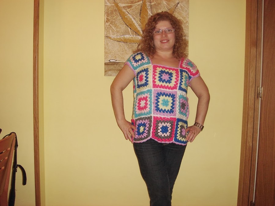 El jersey esta hecho a ganchillo con hilo de perle de colores, ha ido haciendo cuadros XL o grannys gigantes y los ha ido uniendo , cada uno de diferente color.