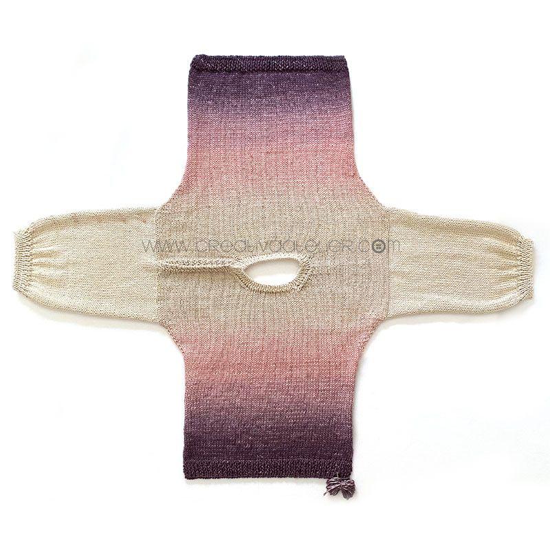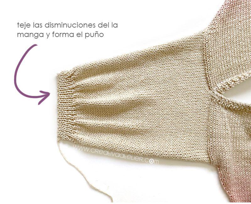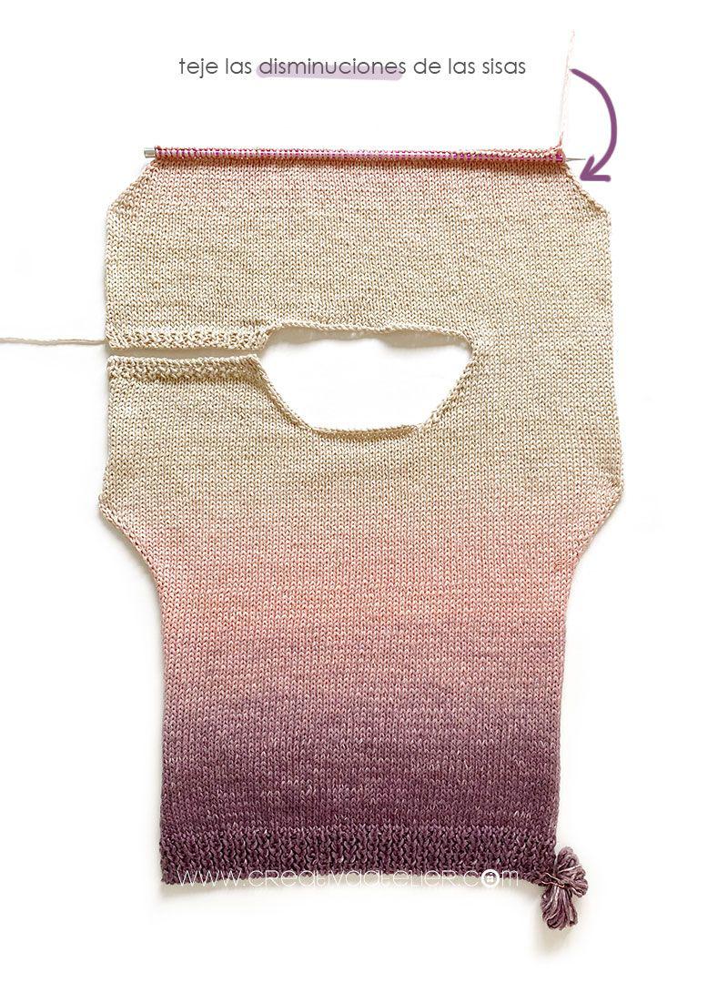 En primer lugar, su manga caída, que conseguiremos trabajando aumentos en las sisas, para ir formando parte de la manga mientras tejemos el cuerpo.