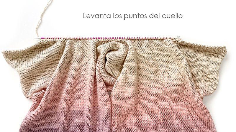 Antes de pasar a tejer las mangas del jersey de punto para niña, vamos a detenernos a terminar la zona del cuello.Con la cara de derecho mirando hacia ti, comienza a levantar los puntos del cuello. Yo en esta ocasión he decidido tejer el punto conforme lo levanto. Puedes aprender viendo este vídeo.