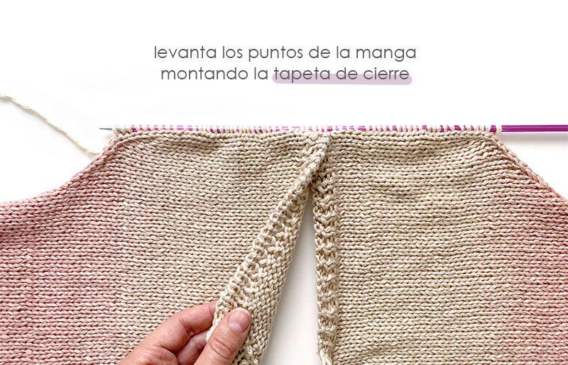 Finalizado todo el cuerpo del sweater de punto, es el momento de tejer las mangas. Vamos a comenzar por la manga izquierda.Con la cara de derecho mirando hacia ti, comienza levantado los puntos de la zona trasera de la manga. Al llegar a la parte de la tapeta, superpón una parte con la otra y levanta los puntos a la vez de ambas partes, continua levantando puntos hasta llegar a la otra axila.