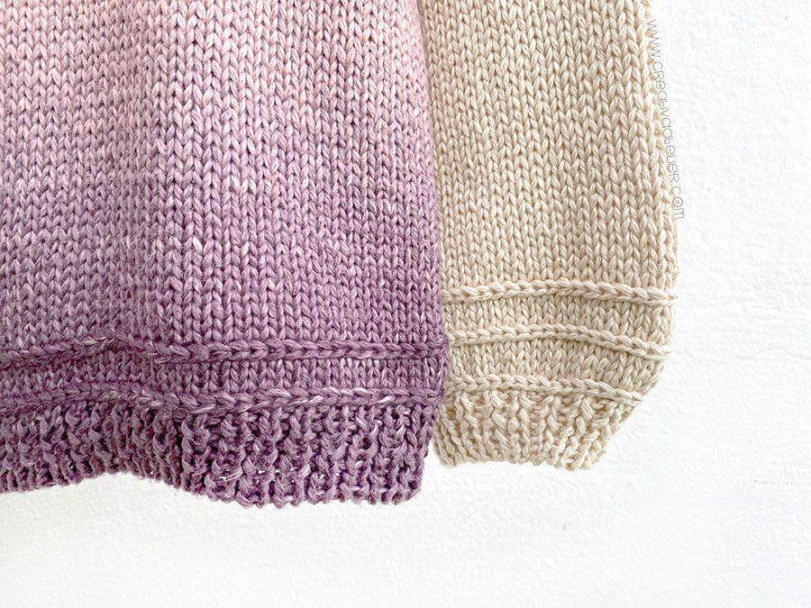 En tercer lugar, los detalles tejidos a cadeneta en cuello, bajo y mangas. Podrás tejerlos del mismo color o con un color a contraste, combinar varios tonos e incluso ¡tejer el arcoíris!
