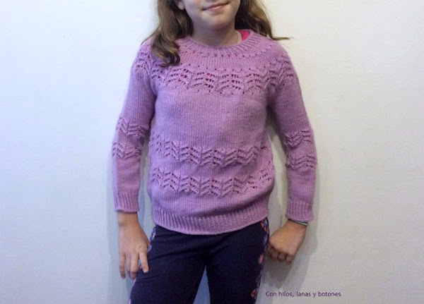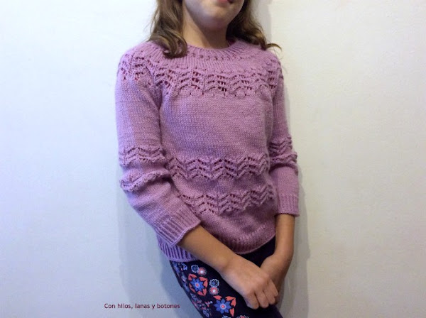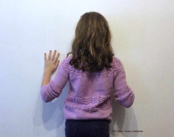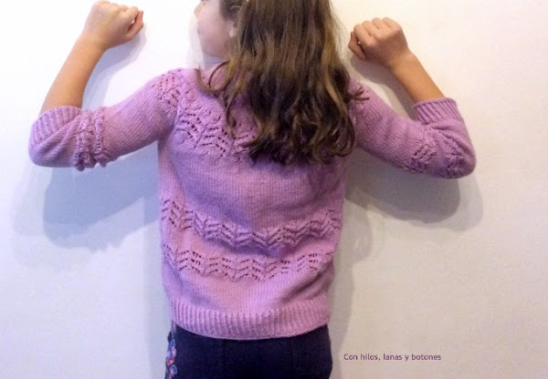 Le valía, sí, pero ya casi no le vale tampoco a mi hija, sobre todo de manga. No llevo nada bien esos estirones repentinos. Tengo otro jersey que le hice y ya no le vale antes de estrenar, ya no me molesté ni en bloquearlo, aun no tengo decidido si regalarlo, o alargar mangas a ver qué tal (creo que tengo una hija bracilarga) o deshacer de todo directamente y aprovechar la lana para otra prenda.