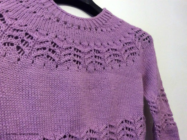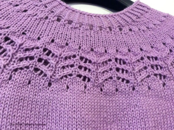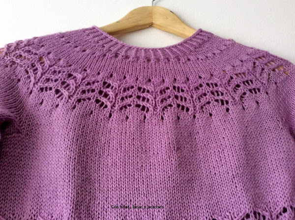 El jersey va empezado por arriba y se teje en redondo de arriba hacia abajo sin costuras, ya sabéis, es un jersey top-down. En el escote lleva una sección de vueltas cortas que hace que siente bien y no quede por delante super pegado a la garganta. El canesú es circular (circular yoke) y es ahí donde empieza el calado, que se repite luego en el cuerpo del jersey y en las mangas.
