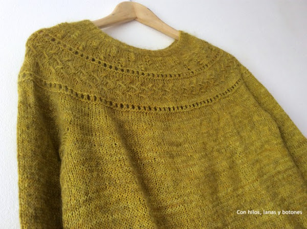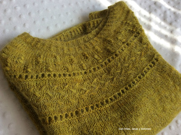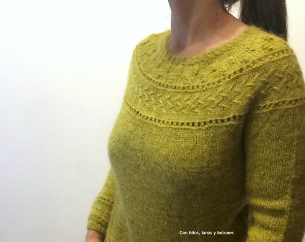 El jersey va empezado por arriba y se teje en redondo de arriba hacia abajo sin costuras, ya sabéis, es un jersey top-down. En el escote lleva una sección de vueltas cortas que hace que siente bien y no quede por delante super pegado a la garganta. El canesú es circular (circular yoke) y es ahí donde tiene la mayor parte de los detalles este diseño. Va alternando unos bodoquitos con vueltas de agujeritos y de cruces de hebras para conseguir un juego de texturas espectacular.
