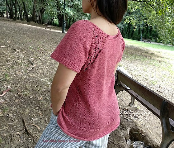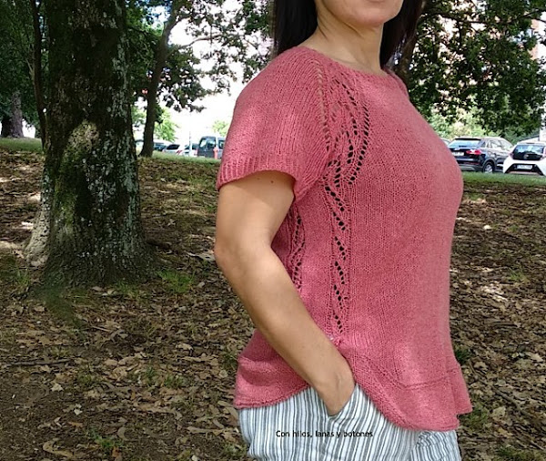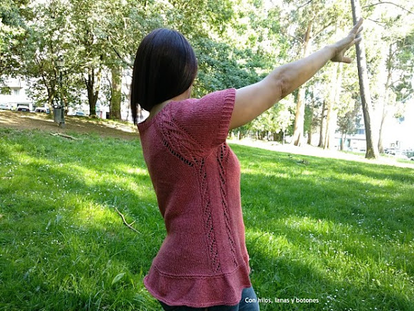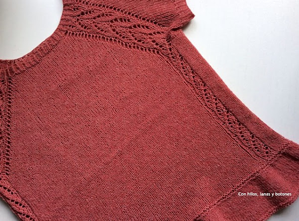 Como podéis ver en las fotos, se trata de un jersey de veranito con manga ranglan. Va empezado por arriba y se teje en redondo de arriba hacia abajo sin costuras. Tiene un calado super chulo que empieza en el escote, adorna el ranglan y baja por el lateral, y un volantito la mar de coqueto en el bajo.