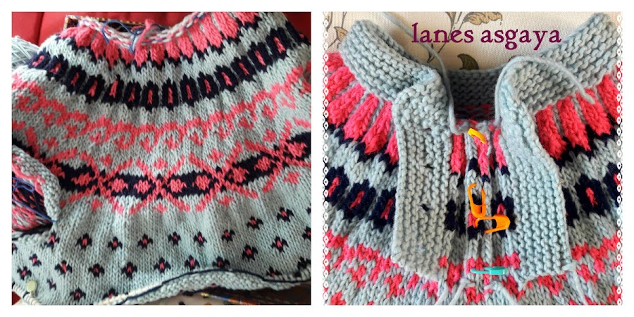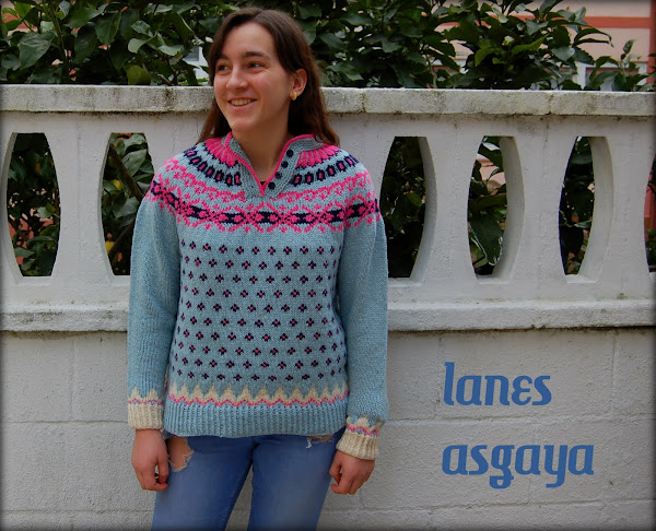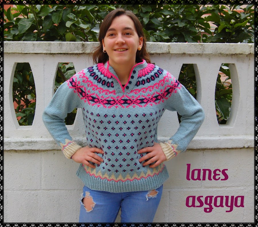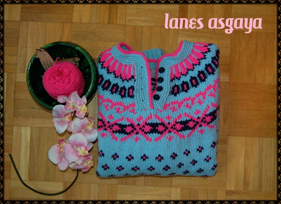 Hice algunos cambios: el patrón de la revista está tejido de abajo arriba y a mí me gustan más de arriba abajo, así que lo cambié. Usé otros colores y, lo que era un precioso jersey de hombre en la revista, se convirtió en un preciosísimo jersey de mujer. y, por último, lo corté, pero no para transformarlo en chaqueta (que no me apetecía), sino para ponerle un cuello al jersey. El resultado: estoy feliz con mi jersey Lopi