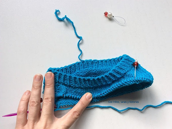 A partir de aquí vamos a ir haciendo los aumentos para el ranglan de las mangas y los bodoques. Salvo que se indique otra cosa se tejen todos los puntos del derecho.