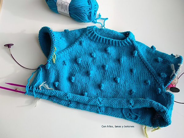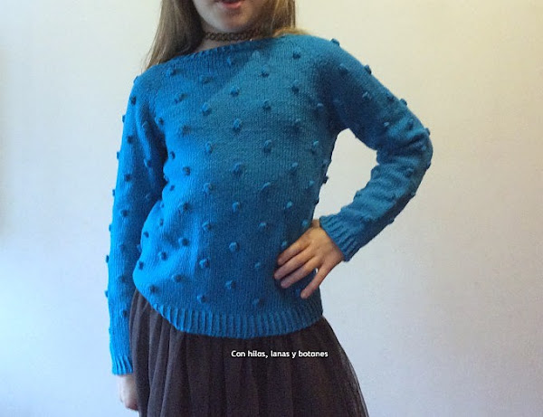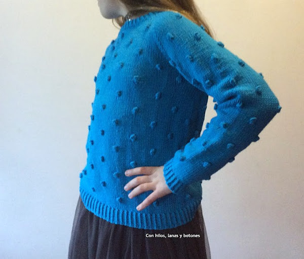 Si os fijáis bien en las fotos del jersey, en algunos bodoques se puede ver un pequeño hueco entre el bodoque y el jersey. Cuando ya llevaba medio jersey hecho me topé con otro vídeo en el que explica cómo hacer los bodoques sin que quede ese hueco. Me lo apunto para la próxima porque no tengo intención de deshacer todo y volver a empezar.