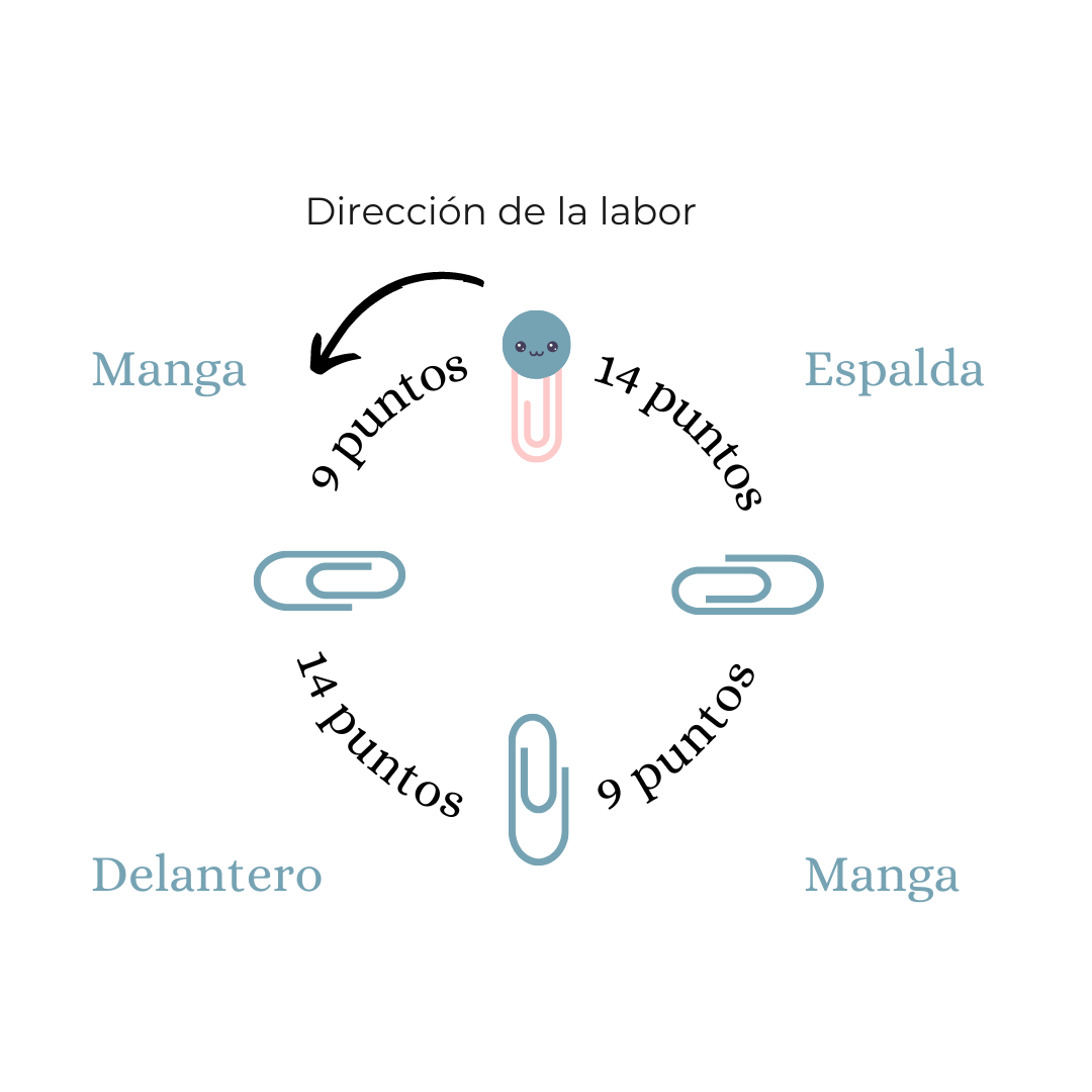 Retomamos los 28 puntos de las mangas que dejamos en espera y cuatro puntos en el cuerpo, aquellos que aumentamos en la vuelta 41, poniendo un marcador en medio de estos cuatro puntos para diferenciar el principio de la vuelta. (32 puntos)1ª, 2ª y 3ª vuelta: