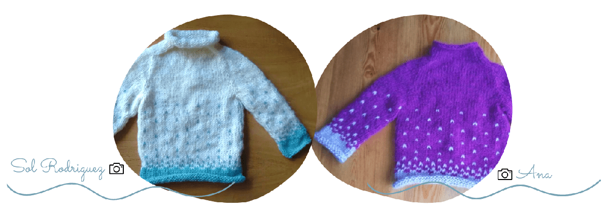 El cuerpo y las mangas van tejidas con la técnica colorwork, combinando dos colores, el de fondo (A) con el de contraste (B)