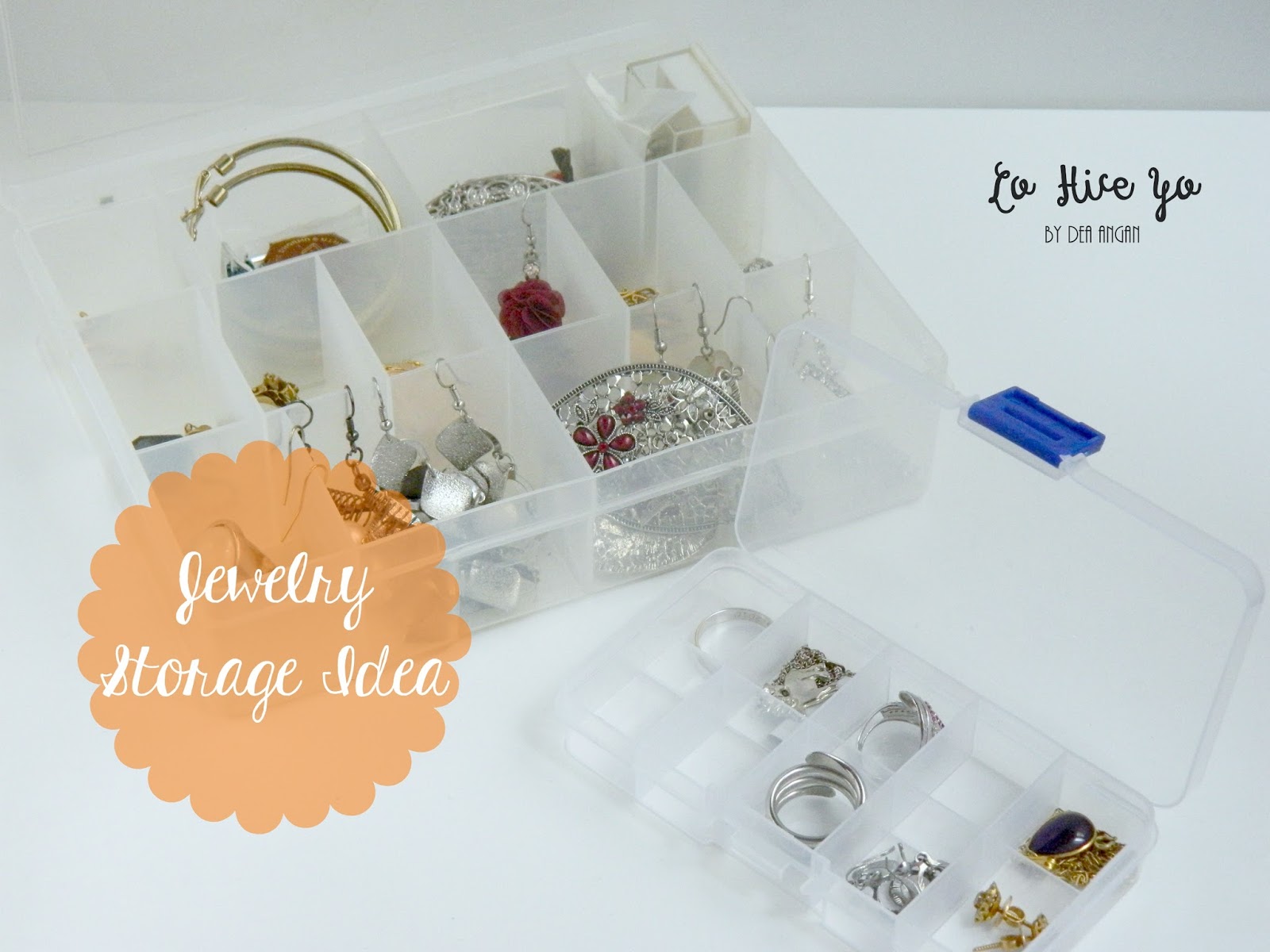 I bought those plastic containers at the dollar store. You have probably known what those containers are. They are divided into several tiny boxes, so I can put one jewelry in each box. Plus, it is easy to find. I often use the smaller container when I travel. I merely need to put the jewelry I need when Im travelling so I dont have to bring a lot of stuff.