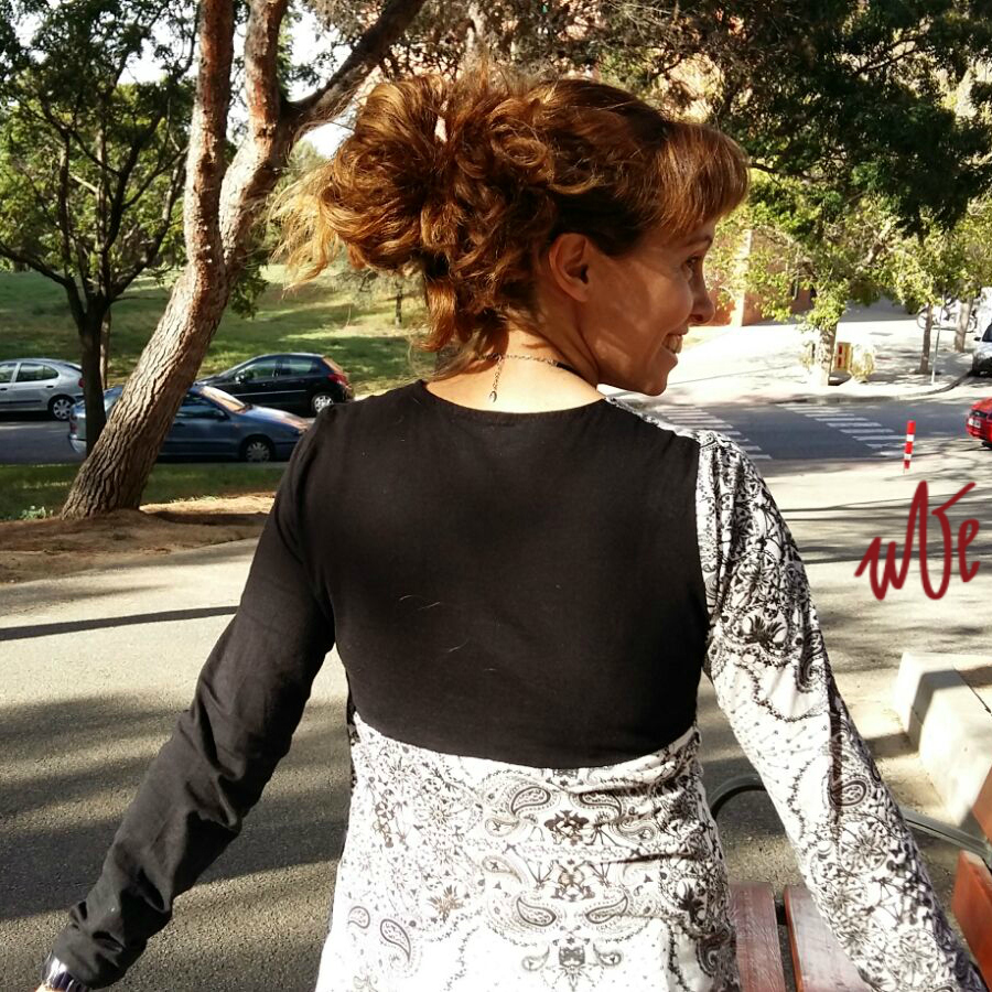 He combinado la tela estampada haciendo una manga de cada color, y la parte superior de la espalda también lisa. Me gusta mucho como ha quedado.