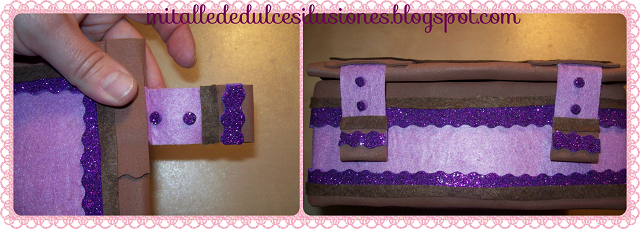 3.Yo para darle un bonito acabado he forrado el interior de goma eva,también le he puesto tiras de goma eva simulando piel,para tapar las juntas del fieltro,con paciencia podéis ir pegando tiras anchas de goma eva o de fieltro como más os guste.