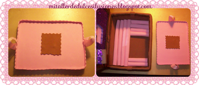 4.Le he puesto un espejito que tenía por ahí,si no tenéis podéis poner cartulina color plata,lo he puesto en el interior de la tapa que se abre y he forrado esa tapa por dentro de goma eva o foami de purpurina y le he puesto un marco al espejito del mismo material.