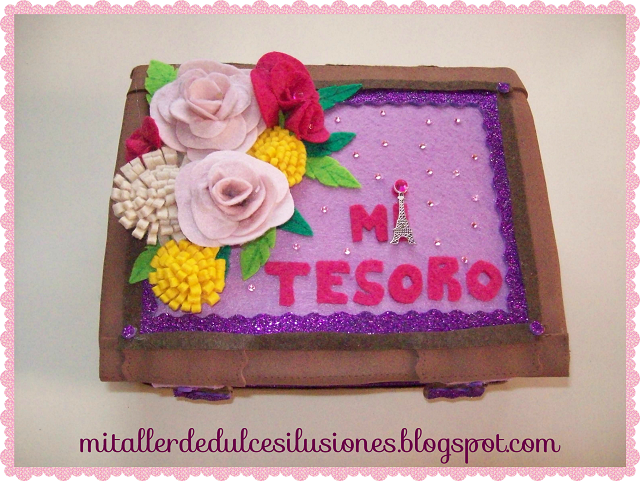 9. Por último decoré la tapa del joyero con unas rosas de fieltro,unos tajetes también de fieltro,unas hojas,letras de fieltro,unos brillantitos y una torre Eifel por que a su dueña le encanta París,y terminamos,¿a qué el resultado es precioso?a mi me parece un muy bonito regalo y muy especial.