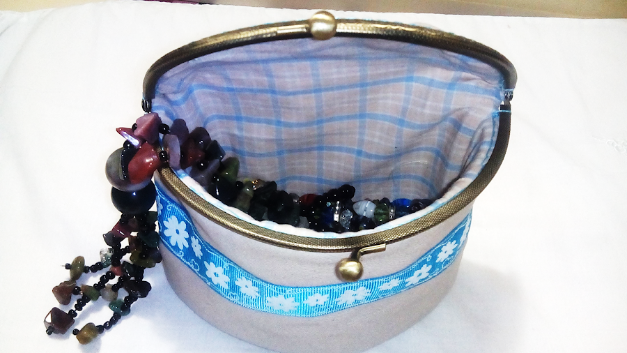 Ahora es el momento de colocar la boquilla y empezar a armarlo. Para ello metemos la boquilla primero por lo que va a ser la tapa superior del joyero, sujetamos con alfileres y cosemos (a través de los agujeros que ya trae la boquilla) con un hilo grueso, yo usaré hilo de bordar. Hacemos lo mismo con el otro lado.