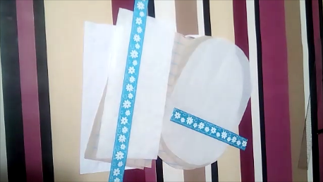 Ahora vamos a trabajar con los óvalos. Por la parte del derecho de la tela exterior, cosí un trocito de cinta para decorar, de esta forma: