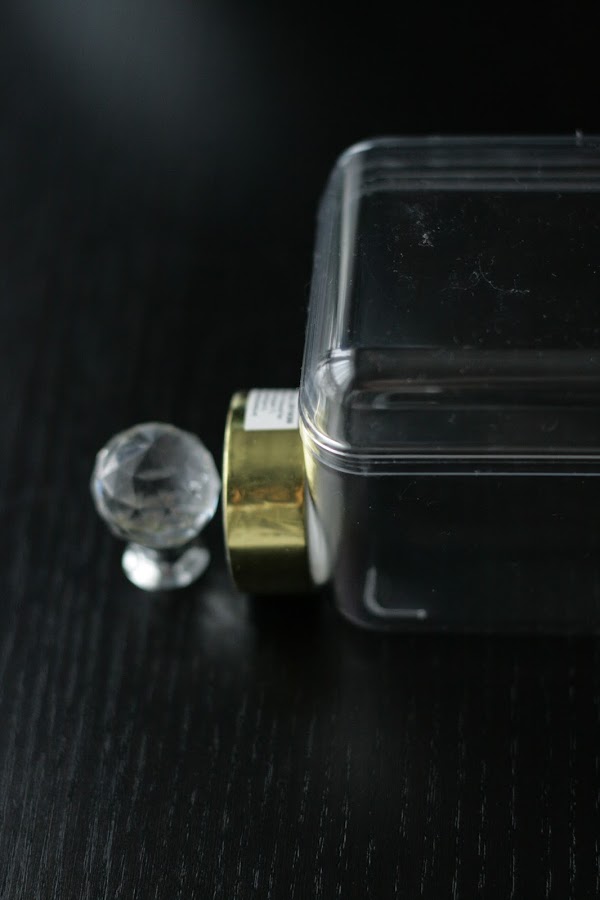 Necesitamos una caja transparente de bombones Ferrero Roché, (previo vaciado de la misma... jjejej) washi tape dorada (yo la encontré en las tiendas TIGER), un tirador bonito y la pistola de silicona.