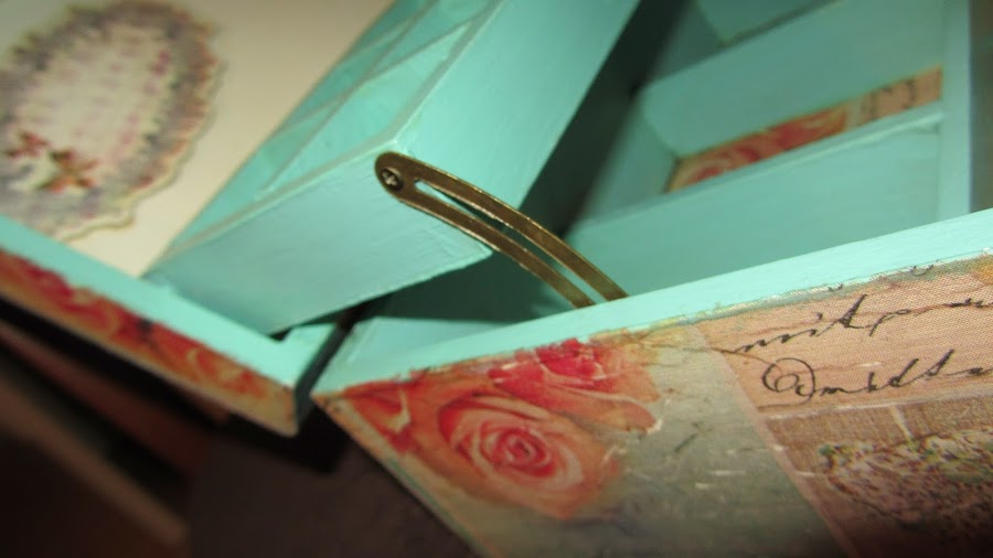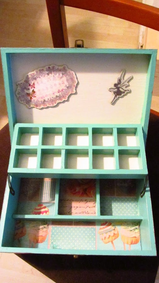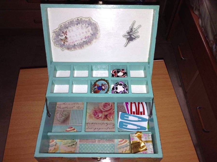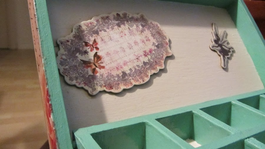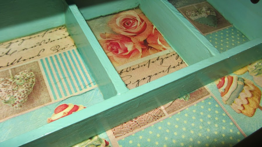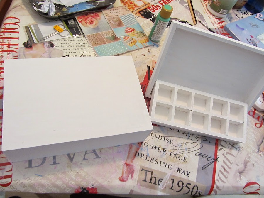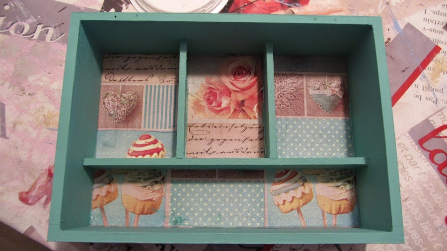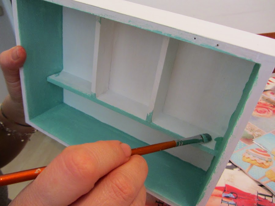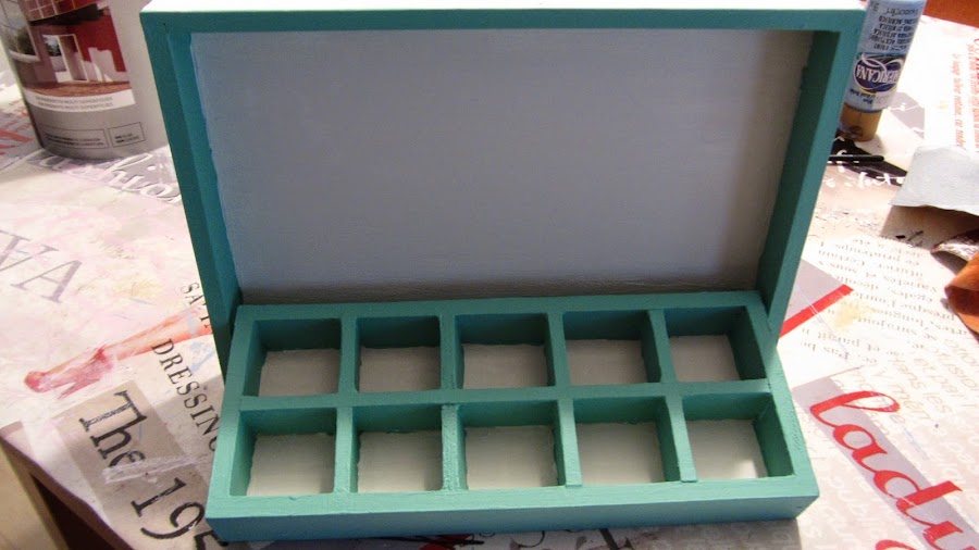 Pinté el culo, los laterales interiores del joyero, las divisiones y los bordes con una mezcla de colores hasta conseguir el color más parecido a la servilleta...
