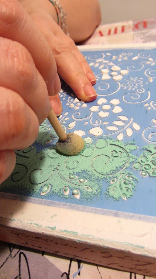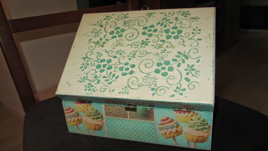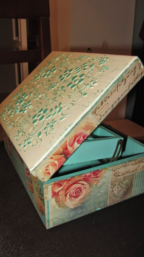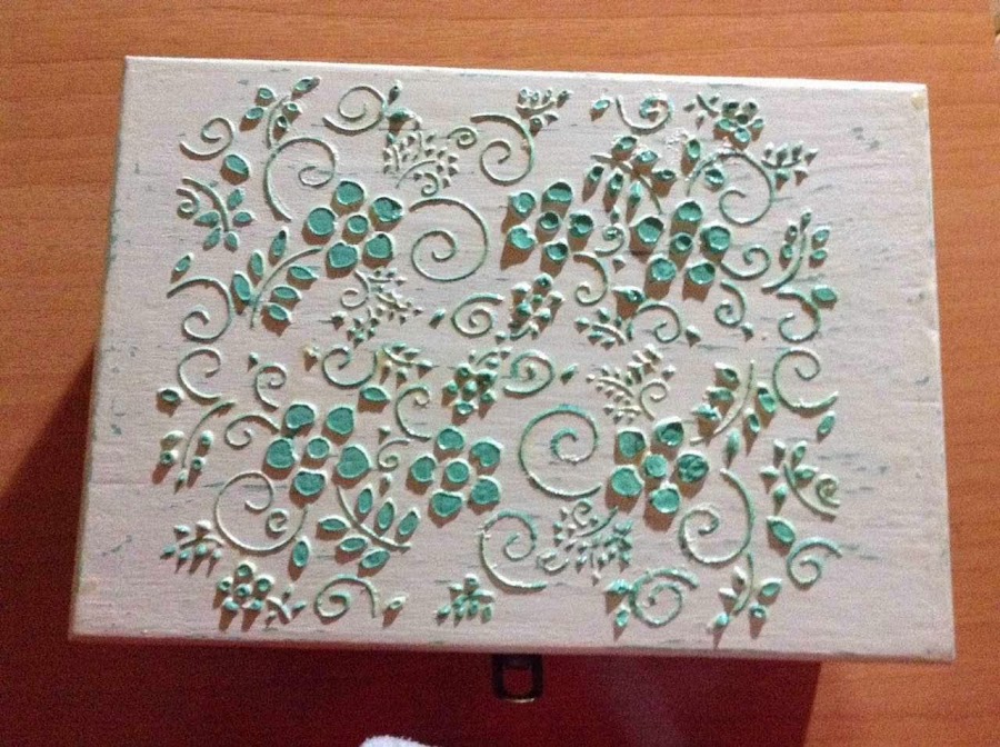 Este es un joyero decorado con stencil en relieve y servilletas... va a juego con el Malma de la entrada siguiente, y junto con la caja de corazón fue el regalo de cumpleaños de mi sobrina Lucía...