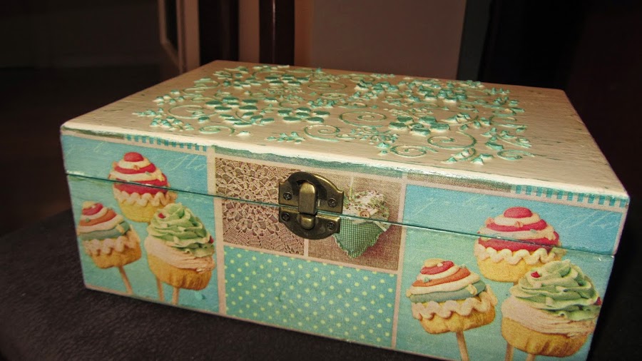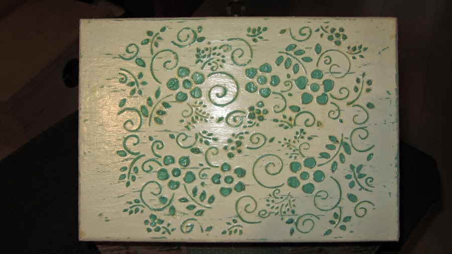En la tapadera le hice un estarcido con pasta de relieve, luego lo pinté del mismo color que el interior...