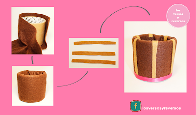 Forra el cartón de la cinta con el fieltro marrón oscuro y pégalo con la pistola de silicón, recuerda ir estirando bien la tela. Cuando esté pegado, pega tiras de fieltro café claro alrededor (en este caso utilicé 6 tiras de 1 cm de ancho) y recuerda poner una tira de fieltro café claro justo en la unión de la tela marrón oscuro para disimularla.