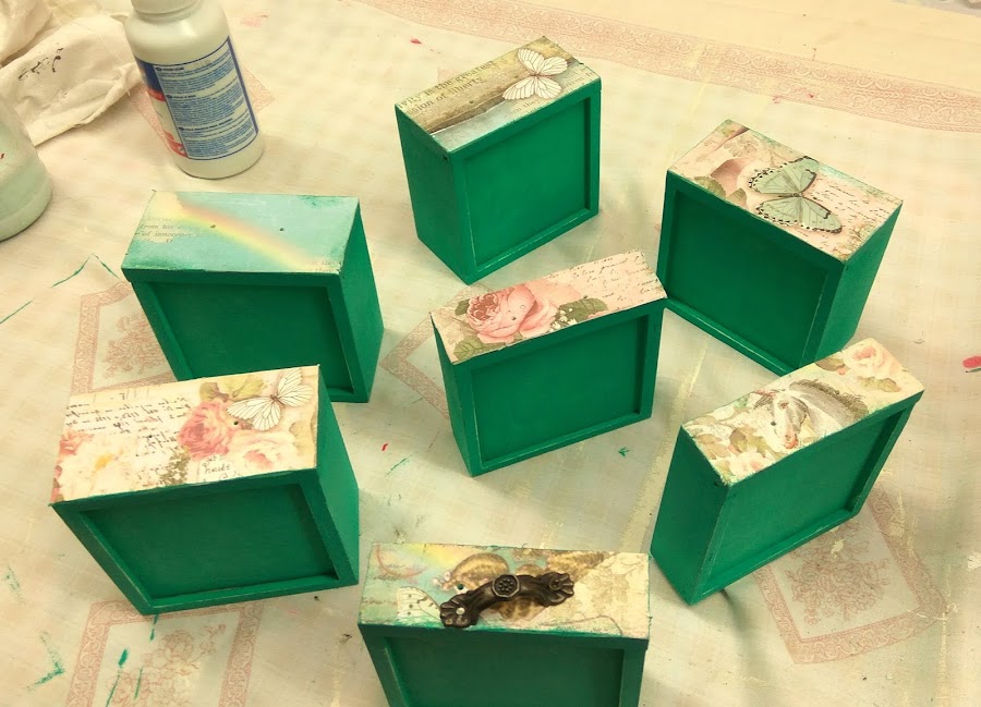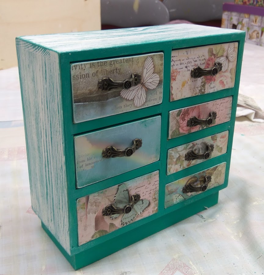 A los cajones les puse papel decorado. Pegándolo con cola. Cada cajón con un motivo diferente.