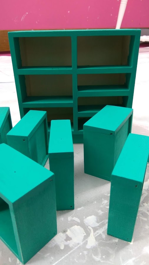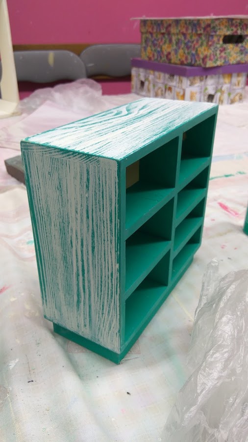 Primero, pinté el fondo con un verde turquesa. Como siempre, dos manos, lijando suavemente entre las capas.