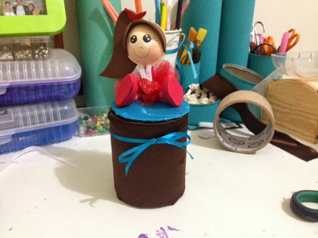 Luego con un pedacito de listón o tela unimos la tapa y decoramos como más nos guste, en mi caso le puse una muñequita que me había quedado de otros trabajos también se puede conseguir en los bazares y un listón alrededor con un chongo.