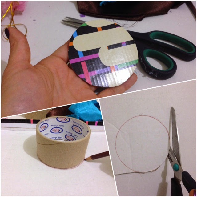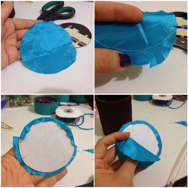Ahora seguimos con la parte de arriba, forramos el otro círculo, para esto necesitamos cortar dos círculos de tela uno más grande que el de cartón y el otro igual al cartón, pegamos primero el más grande y le hacemos unas pequeñas pestañas alrededor y pegamos las pestañas, luego para tapar esas pestañas le pegamos el circulo que es del tamaño del cartón.