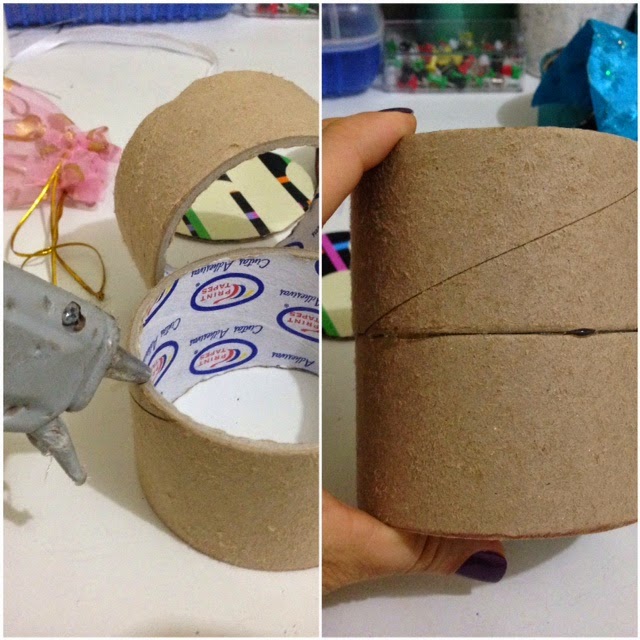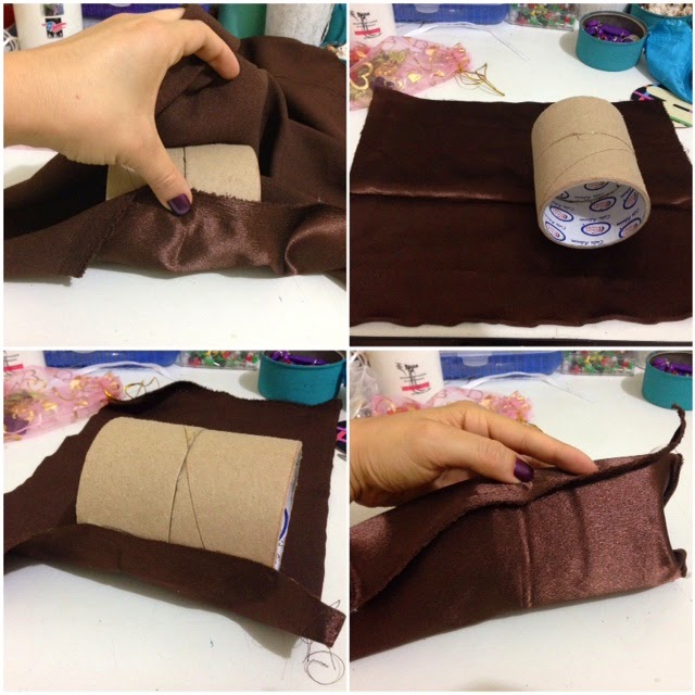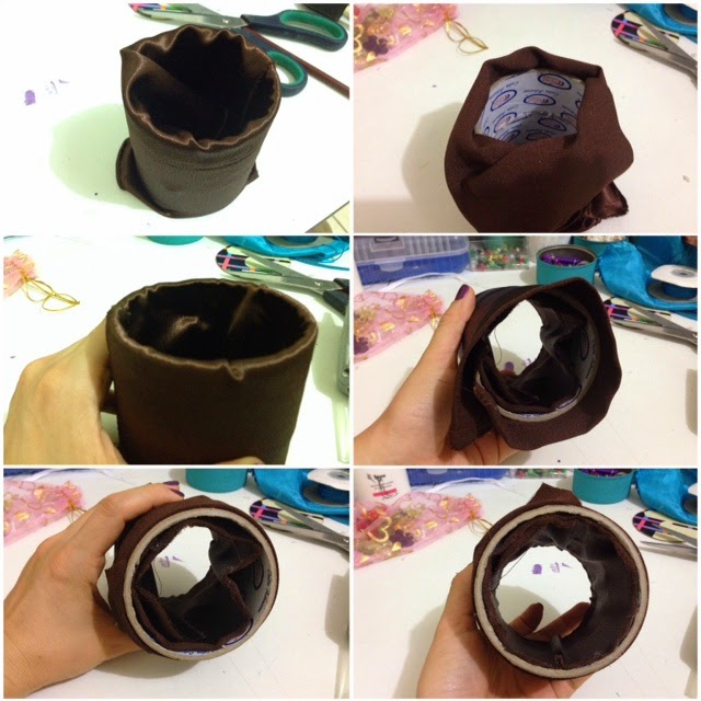 Forramos con la tela en un extremo, la enrollan y pegan el otro extremo en el tubo (tengan cuidado de que la tela de adentro cubra todo el fondo, yo deje como un centímetro abajo en el lado de afuera.