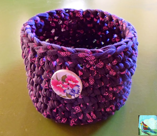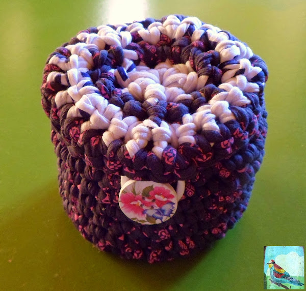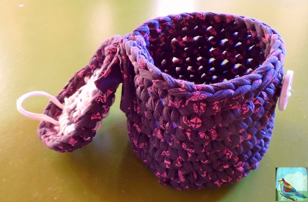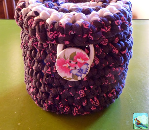 Por último atamos los dos cabos que nos quedan, el de la tapadera y el de la cesta, rematamos las puntas que nos queden sueltas, le cosemos un botón y le colocamos un trozito de trapillo a modo de cierre.