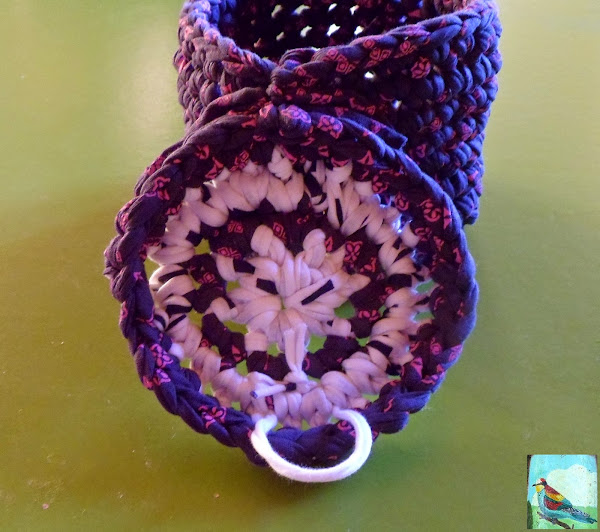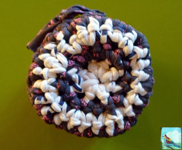 Las siguientes vueltas son todas de 28 puntos bajos cogiendo ya los dos aritos, o sea, como se hacen normalmente, y sin aumentos ni disminuciones. Todas estas vueltas comienzan siempre con una cadeneta y terminan con un punto raso. Haremos el número de vueltas según la altura que queramos dar a la cesta, yo he hecho 8 vueltas, con las 4 de la base serían un total de 12 vueltas. Cortamos el trapillo dejando un cabo largo para luego unirlo a la tapadera mediante un lazo como se aprecia en la foto.
