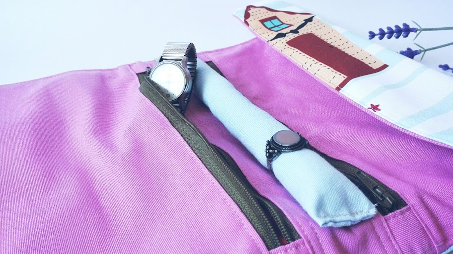 Tiene dos bolsillos pensados para que guardes tus pulseras, pendientes...y un rulito central para meter en él todos tus anillos viajeros.